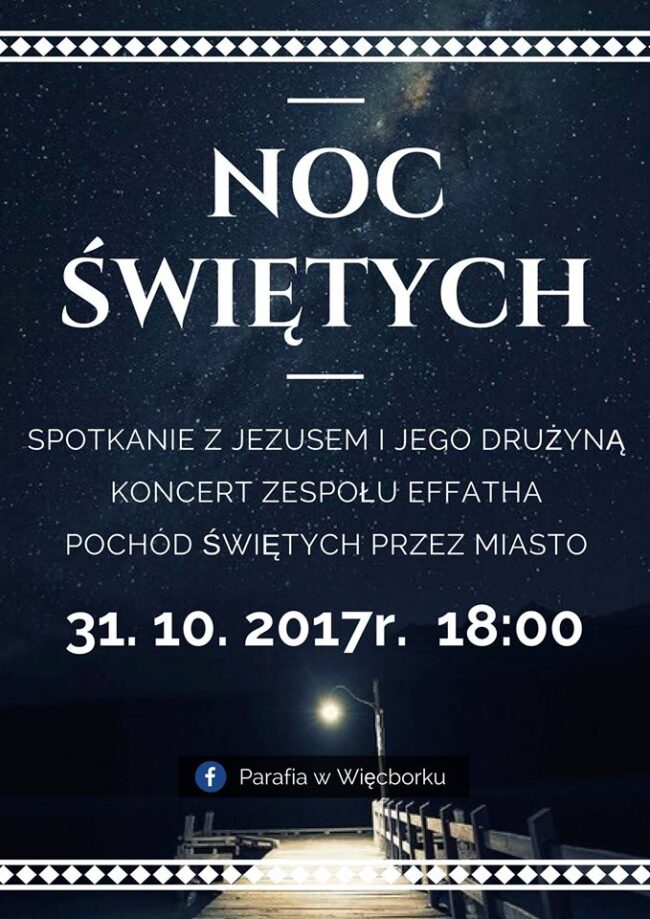 Zapraszamy serdecznie na „Noc Świętych”, która rozpocznie się 31 października o godz. 18:00. Podczas wieczornej modlitwy odnowimy przyrzeczenia Chrztu Świętego, uczcimy relikwie świętych osób oraz przeżyjemy Adorację Najświętszego Sakramentu. Naszemu spotkaniu z Panem Jezusem i Jego drużyną będzie towarzyszył zespół Effatha. Na koniec wieczornego czuwania zapraszamy wszystkich na pochód świętych, który przejdzie ulicami Więcborka. Do…
