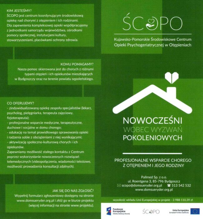 Istnieje możliwość uzyskania pomocy i wsparcia w opiece nad osobami ze stwierdzonym przez lekarza otępieniem, czyli np. chorobą Alzheimera czy zaburzeniami pamięci. Pomoc jest całkowicie bezpłatna, świadczona w domu, finansowana z funduszy Unii Europejskiej. Pomoc będą świadczyli lekarze, pielęgniarki, fizjoterapeuci, terapeuci zajęciowi i psycholodzy kierowani przez Dom Sue Ryder z Bydgoszczy. Zainteresowani mogą zgłaszać się…