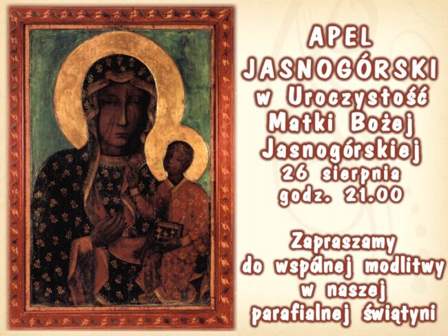 Już w najbliższy poniedziałek, 26 sierpnia zapraszamy na Mszę Świętą w uroczystość Matki Bożej Jasnogórskiej, a także na Apel Maryjny o godz. 21.00 Jestem! Pamiętam! Czuwam!