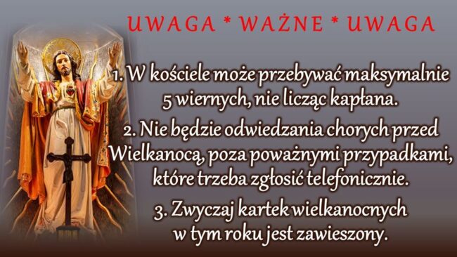 Uwaga – nowe ogłoszenia parafialne KomunikatyPrzez Parafia Więcbork2020-03-25Zachęcamy do zapoznania się z bieżącymi ogłoszeniami parafialnymi: Ze szczególnością podkreślamy: