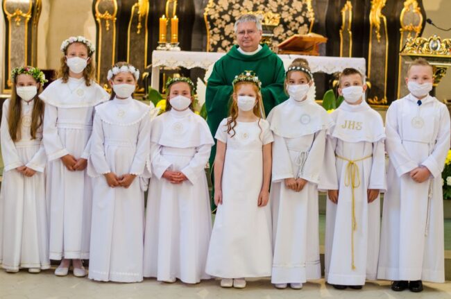 Poniżej krótka fotorelacja z uroczystości przyjęcia I komunii świętej w naszej parafii w okresie pandemii. fot. Paweł Węgrzyn
