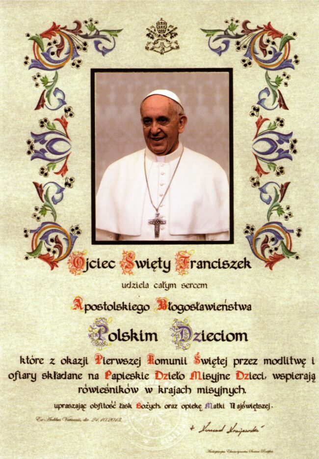 Błogosławieństwo Papieża Franciszka i podziękowanie Dyrektora Papieskich Dzieł Misyjnych dla Dzieci Pierwszokomunijnych. bez kategoriiPrzez proboszcz2023-06-24