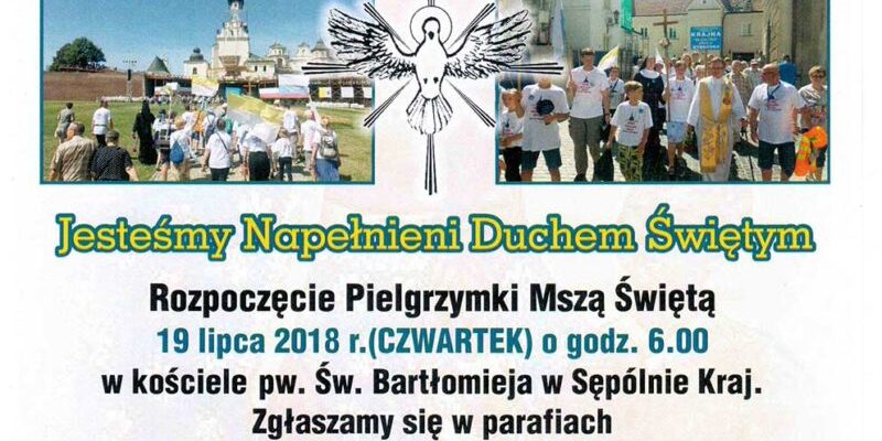 Zapraszamy do udziału w XXXV Pieszej Krajeńskiej Pielgrzymce na Jasną Górę. Rozpoczęcie Pielgrzymki Mszą Świętą 19.07.2018r. (czwartek) o godz.6:00 w Kościele pw. Św. Bartłomieja w Sępólnie Krajeńskim. Zgłaszamy się na parafiach lub u ks. Mariana Kotewicza tel.kom. 601 415 620.