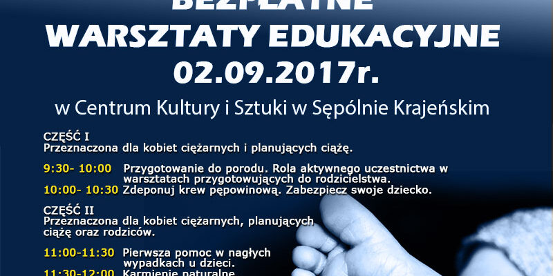 Szpital Powiatowy w Więcborku zaprasza na warsztaty edukacyjne dla kobiet w ciąży, planujących ciążę i rodziców, które odbędą się w Centrum Kultury i Sztuki w Sępólnie Krajeńskim 2 września od godziny 9.30 do 15.30. Szczegółowy program wywieszony jest w gablocie w kruchcie kościoła oraz na stronie internetowej Szpitala.
