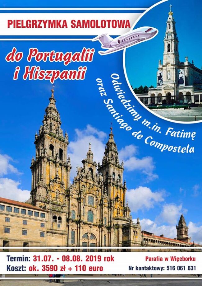 Jest jeszcze 5 wolnych miejsc na pielgrzymkę samolotową do Portugalii i Hiszpanii w terminie od 31 lipca do 8 sierpnia. Koszt wynosi 3590 zł + 110 euro na dodatkowe opłaty. Zainteresowanych prosimy o kontakt z ks. Tomkiem.