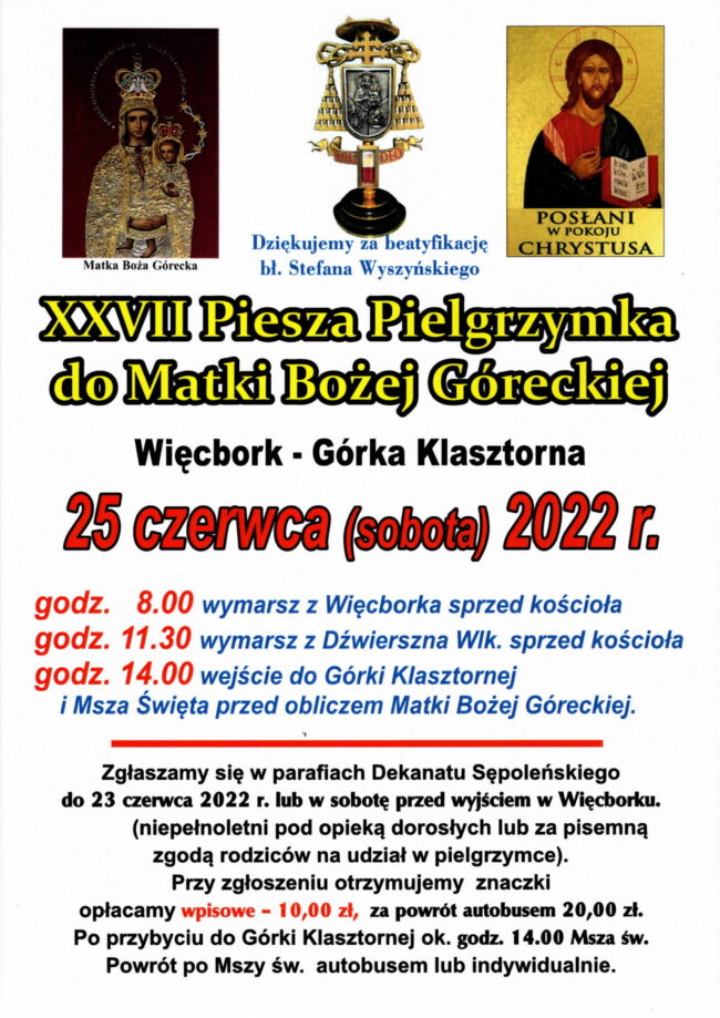 Z radością informujemy, iż po dwuletniej przerwie, 25 czerwca odbędzie się pielgrzymka do Górki Klasztornej. Więcej informacji znajduje się na plakacie poniżej.