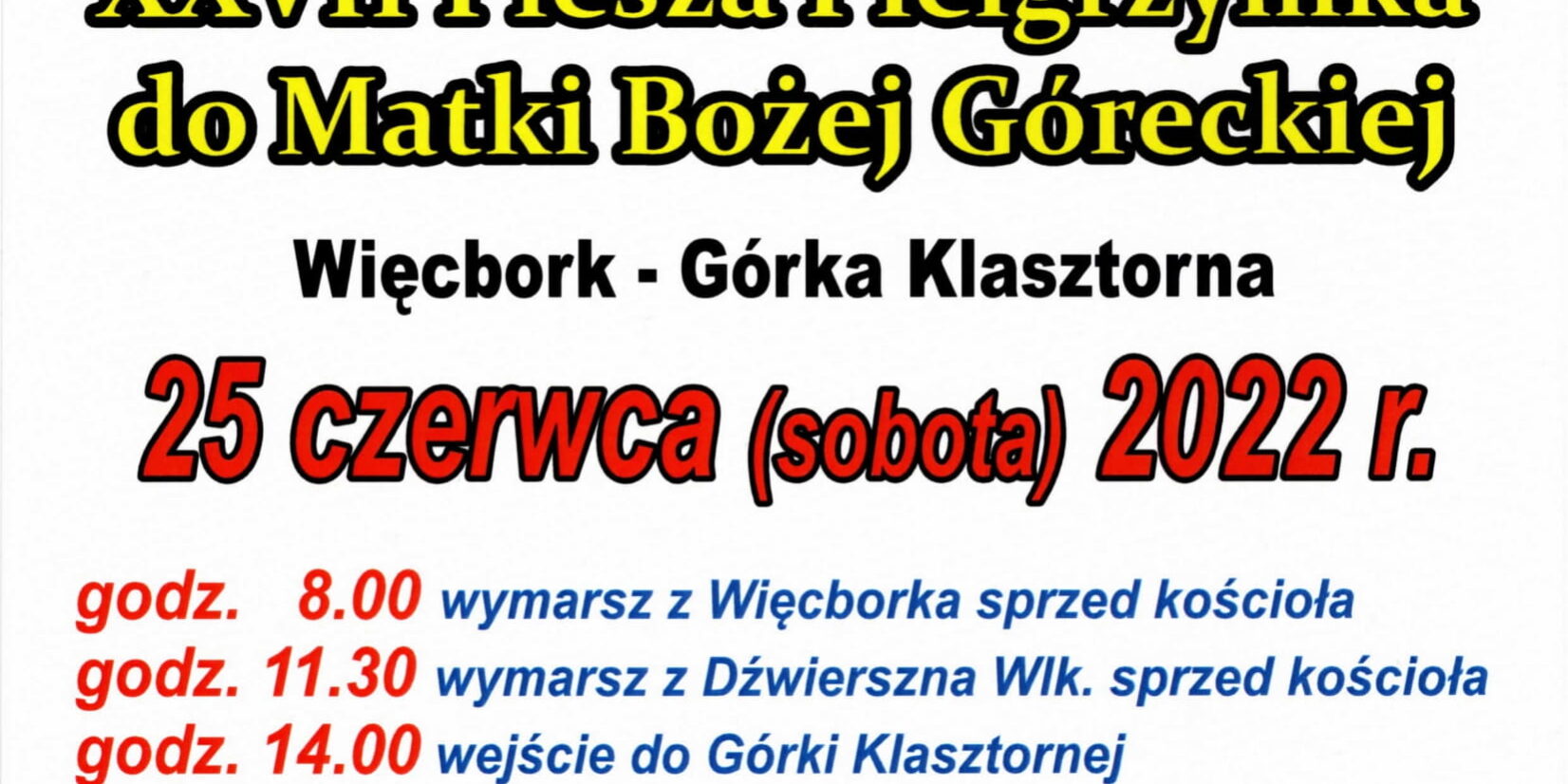 Z radością informujemy, iż po dwuletniej przerwie, 25 czerwca odbędzie się pielgrzymka do Górki Klasztornej. Więcej informacji znajduje się na plakacie poniżej.