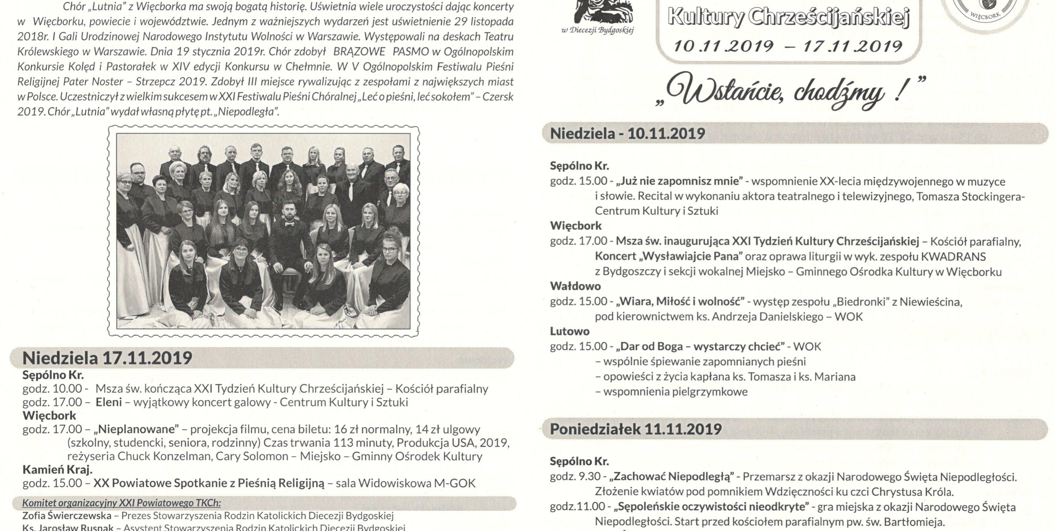 Zapraszamy do zapoznania się i skorzystania w dniach 10.11.2019 r. – 17.11.2019 r. z bardzo bogatej oferty kulturalnej XXI Powiatowego Tygodnia Kultury Chrześcijańskiej. W sposób szczególny zapraszamy na wykład p. Grażyny Szabelskiej, wykładowcy akademickiego w Bydgoszczy, na temat zagrożeń rodziny i wychowania we współczesnym świecie – we wtorek o godz. 18.30 w Centrum Aktywności Seniora, oraz „Muzyka liturgiczna w myśli ostatnich papieży” przygotowany przez ks. Łukasza – w środę o godz. 18.00 w Sali Lustrzanej MGOK w Więcborku, a także wykład „Niech zstąpi Duch Twój…” – refleksja w 40. rocznicę Pierwszej Pielgrzymki Jana Pawła II do Polski” – przygotowany przez ks. Macieja – także w Sali Lustrzanej MGOK w Więcborku w czwartek o godz. 18.00. Zapraszamy też na koncert Chóru Lutnia w sobotę, 16 listopada o 18.00 w Ośrodku Kultury w Więcborku.
